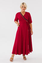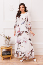 Классическое женское платье полуприлегающего силуэта из мягкой приятной к телу непросвечивающейся ткани в горошек. Платье с V-образным вырезом горловины и втачными рукавами на резинке по низу застегивается на петли и пуговицы. По низу изделия отрезной валан с небольшой сборкой. В комплект входит съемный пояс. Длина 110 см, длина рукава 48 см.