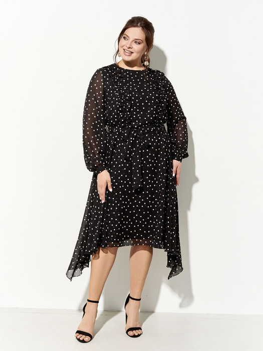 Женское платье в горошек полуприлегающего силуэта выполнено из двух видов тканей: верхнее - из шифона, нижнее - из сатина. Платья скреплены между собой. По переду изделия - декоративные настрочные рюши; по линии талии вставлена резинка; втачные рукава с манжетой по низу застегиваюся на петлю и пуговицу; удлененная линия низа по бокам. По спинке вырез в виде "капельки", который застегивается на петлю и пуговицу. В комплекте съемный пояс из основной ткани. Платье полностью соотвествует заявленному размеру. Пожалуйста, пользуйтесь таблицей обмеров готового изделия.