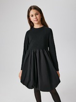 Платье коктейльное для девочки А-образного силуэта, средней длины, с втачными короткими рукавами на манжетах с круглым вырезом горловины. Полочка и рукава из нарядной ткани с пайетками на подкладке из кулирного полотна. Боковые швы платья декорированы ши