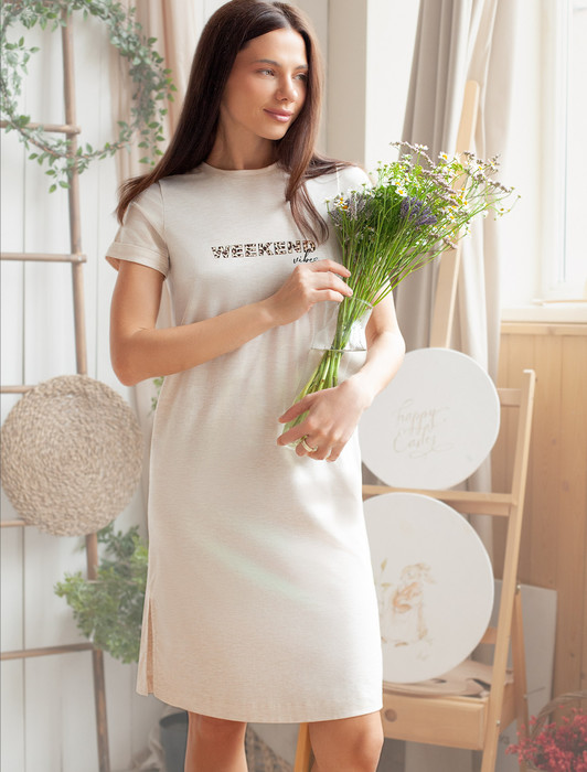 Состав: 92%Хлопок 8%ПУ Плотность: 170 Г/м2 Параметры модели на первом фото: Рост 170, бюст 89, талия 63, бедра 92Домашнее платье выполнено из премиального хлопка с авторским принтом. Weekend vibes - настрой на выходные. Изделие приятно ощущается на теле, а разрезы по бокам обеспечивают удобную посадку не сковывая движений. Наличие эластана в составе изделия способствует формоустойчивости и меньшей сминаемости.