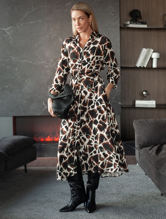Состав: 100%Вис Параметры модели на первом фото: Рост 172, бюст 88, талия 64, бедра 88Платье выполнено из 100% вискозного твила. В комплект входит пояс из основного полотна с золотистой пряжкой. Модель дополнена карманами. Ткань приятно охлаждает кожу в жаркое время года и изящно струится при каждом движении.