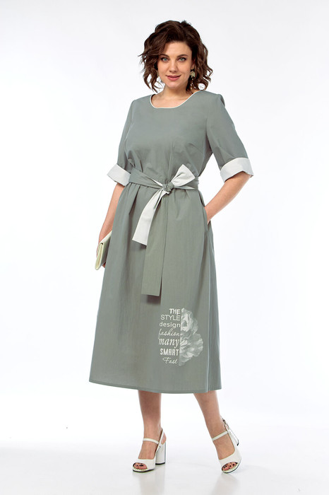 Платье женское А-силуэта выполнено из плательной ткани. Горловина округлой формы обработана обтачкой с кантом из отделочной ткани. Платье разрезное по линии талии, нижняя часть по переду и спинке с небольшой сборкой. Рукава втачные с отложными манжетами из отделочной ткани. В боковых швах обработаны карманы. Пояс платья выполнен путем комбинирования основной и отделочной ткани. Изделие декорировано дизайнерской печатью.