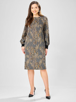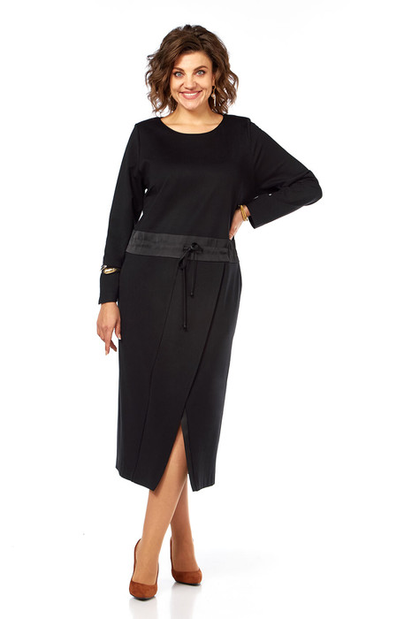 Платье женское прямого силуэта, изготовлено из трикотажного полотна и атласа. Платье отрезное ниже линии талии, со вставкой имитирующей пояс из отделочной ткани, с кулисой и втянутым шнуром. Горловина круглой формы с отделочным кантом. В нижней части платья обработан элемент с эффектом запаха. Обработаны карманы. Рукава втачные, длинные. Спинка разрезная с фигурным низом.