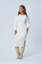 Платье женское прямого силуэта, изготовлено из натуральной ткани. Горловина круглой формы. По переду нагрудные вытачки. На спинке средний шов. В боковых швах обработаны карманы, внизу разрезы. Рукава втачные, разрезные с фигурным вырезом. Платье декорировано дизайнерской вышивкой.