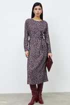 Платье женское из гладкокрашеного тканого полотна, свободное,слегка расширенное к низу, с горловиной овальной формы, короткими втачными рукавами, вытачками в области груди, карманами в боковых швах. Перед состоит из двух частей, в шве соединения деталей по центру разрез, горловина окантована основным материалом.