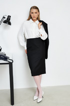 Вырез горловины платья «лодочка», застежка на потайную тесьму-молнию в левом боковом шве. Деталь переда и спинки платья с кокеткой, украшенной пайетками, нижняя часть с рельефными швами, со средним швом, который заканчивается разрезом. Линия плеча спущена, рукав короткий. В комплекте съемный декоративный пояс из основной ткани и декоративное украшение.