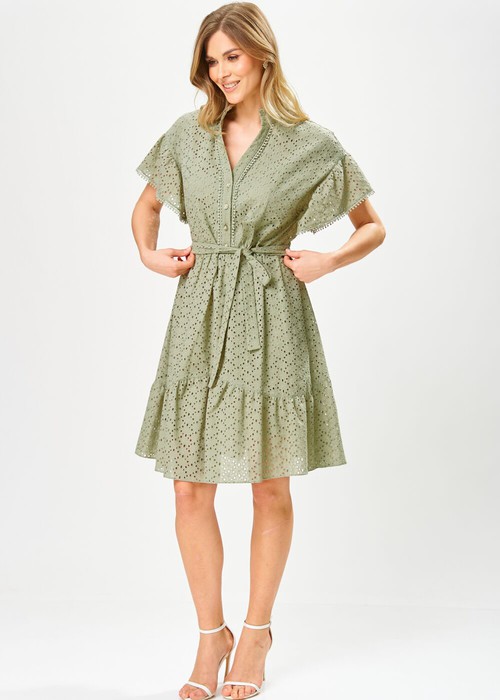 Платье женское из перфорированного хлопка, свободного силуэта, на подкладке,расширенное книзу, длиной ниже коленей,с втачной стойкой по горловине, отрезное на уровне линии талии, со съемным поясом. Лиф деталей переда платья с застежкой на 4 петли и 4 пуговицы, с «V-образным» вырезом, с нагрудными вытачками, исходящие от линии талии, с притачными планками. В шов притачивания планок вставлена декоративная тесьма. Юбка платья конической формы, с горизонтальным подрезом фигурной формы, по швам соединения обработана сборка. Рукава втачные одношовные, короткие, со сборкой по шву втачивания, низ рукавов декорирован отделочной тесьмой. По горловине втачная стойка с «рюшей». Длина рукава – 12см, ширина рукава – 33см, длина спинки – 98см.