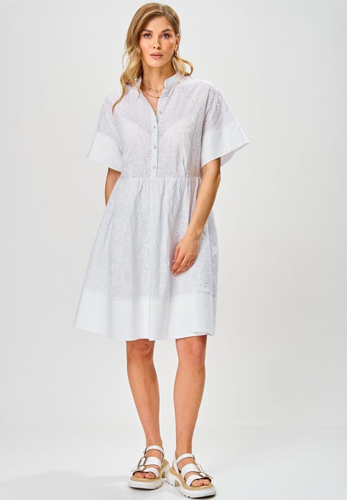 Платье женское из вышитого хлопка, свободного силуэта, на подкладке,расширенное книзу, длиной ниже коленей,со спущенной линией плеча, с втачной стойкой по горловине, отрезное на уровне линии талии, со съемным поясом. Лиф деталей переда платья с застежкой на 5 петель и 5 пуговиц, с 2-мяскладками, исходящие от линии талии, с цельнокроеными планками. Юбка платья конической формы, с горизонтальным подрезом, по шву соединения с лифом обработана сборка. Рукава втачные одношовные, короткие. По горловине втачная стойка. На уровне линии талии по боковым швам прикреплены шлевки для протяжки съемного пояса. Длина плеча – 28см, длина рукава – 9см, длина спинки – 96см.