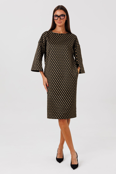 Платье прямого силуэта со спущенной линией плеча. Спинка изделия имеет средний шов с открытой шлицей, высотой 22 см. В боковых швах изделия: карманы. Рукав притачной со спущенной проймой и укороченной длины. Спереди рукава заложена открытая шлица. Горловина платья имеет форму округлой «лодочки», которая обработана устойчивой бейкой, шириной 1 см.