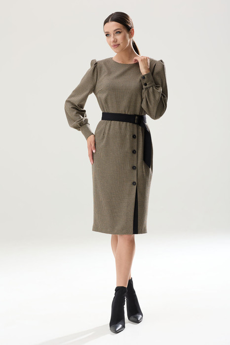 Восхитительное платье на любой случай! Платье отрезное по линии талии. Лиф с нагрудными и талиевыми вытачками. На спинке-талиевые вытачки, которые делают силуэт изящнее. По линии талии, для балансирования размерного объема, в шов вставлена эластичная тесьма (резинка, шириной 1 см). Горловина округлой формы. По окату и низу рукава-сборка. Рукав втачной, одношовный, длиной 64,5 см на манжете, высотой 8 см и застежкой на петли-пуговицы. Нижняя часть платья-прямого силуэта, чуть зауженная к низу. По линии талии также расположены талиевые вытачки. Конструктивная деталь - смещенный разрез с контрастными планками на пуговицах, разрез функциональный. В среднем шве спинки расположена застежка - потайная молния. Длина платья по спинке 105 см. Длина юбки платья от талии 66 см.