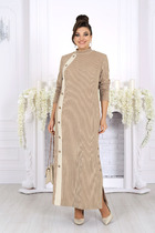 Платье состоит из отрезного удлиненного лифа и юбки, состоящей из трех горизонтальных воланов на сборке. Спереди изделие имеет нагрудные горизонтальные вытачки, вертикальную функциональную планку-застежку на петли-пуговицы. Горловина обработана воротником-стойкой. Длина отрезного лифа по спинке 49 см. Пройма лифа обработана косой бейкой. Длина изделия по спинке 130-133 см (в зависимости от размерного ряда).