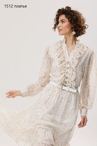 Платье прямого силуэта, слегка приталенное в области талии. Рукав втачной. Снизу часть рукава собрана на эластичную тесьму. По переду платья нагрудные выточки, накладные карманы с настрочными клапанами. По спинке в среднем шве потайная молния.