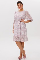 Платье выполнено из струящейся ткани с люрексом. Платье свободного силуэта. Горловина округлой формы обработана обтачкой. Рукав втачной, расклешённый к низу. По переду платья нагрудные выточки.