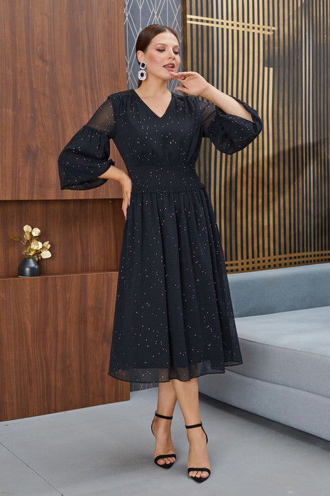 Платье с V- образным вырезом горловины и отрезной деталью собранной на венгерку по талии. Перед с  кокеткой. Рукава втачные, состоящие из двух частей. Нижняя часть со сборкой и на подкладке. Платье на отлетной по низу подкладке.