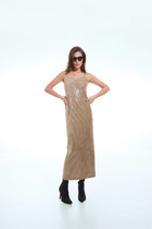 Платье с округлым вырезом горловины и отрезное по талии. Перед с декоративной пуговицей в верхней части, фигурным вырезом и со складками в нижней части. Спинка с потайной молнией в среднем шве и талиевыми вытачками. Рукава втачные, выполненные из ажурной сетки с серебристым напылением. Изделие со съёмным поясом по талии и карманами в боковых швах.
