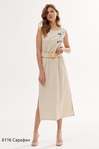 Платье с округлым вырезом горловины, отрезное ниже линии талии и сборкой от неё. Перед с двумя рельефами от горловины до боковых швов и карманами в них. Спинка с потайной молнией в среднем шве и талиевыми вытачками до отрезной детали ниже линии талии. По низу платья идёт волан со сборкой. Рукава втачные. Изделие на подкладке.