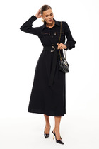 Платье с V – образным вырезом горловины, цельнокроеными рукавами и съёмным поясом по талии. Спинка с талиевыми вытачками и разрезом в среднем шве. Рукава с манжетами по низу.