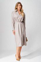 Платье прямого силуэта, длиной ниже колена, со спущенной линией плеча и рукавами на основе цельнокроеного. Спинка и перед с горизонтальной кокеткой. Застежка спереди на планку и петли-пуговицы. Воротник рубашечный на стойке. По линии бёдер диагональный подрез. По переду нижней части платья глубокая складка. Пояс в комплекте.