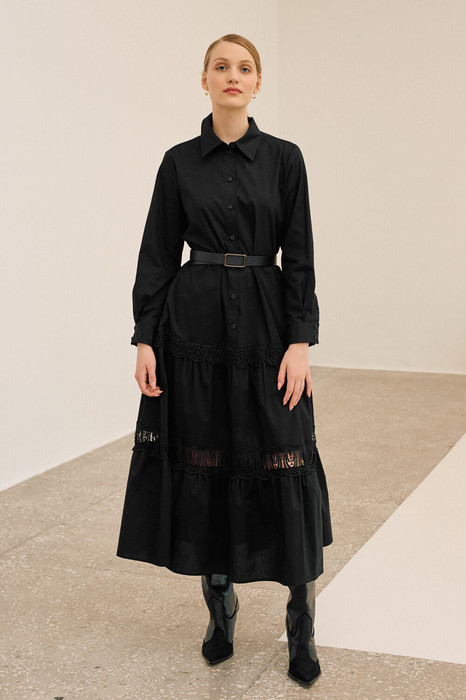 Платье выполнено из хлопковой ткани, длиной миди, свободного А-силуэта. Застежка центральная на петли и пуговицы. Воротник рубашечного типа, рукав втачной, длинный. Линия талии фиксируется съемным поясом. В боковых швах карманы, по воланам вшито кружево.