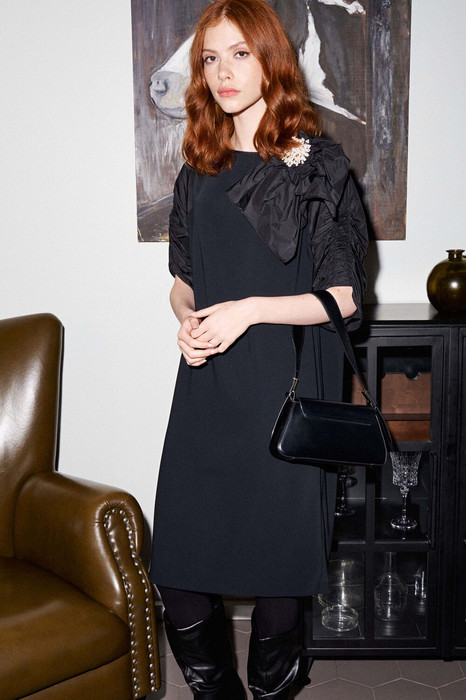 Платье свободного силуэта, выполнено из плательной ткани. Горловина формы «лодочка». Рукав реглан 3/4, выполнен из отделочной ткани «тафта», шов втачивания рукава имеет фигурную форму. По передней части рукава сборка. По спинке средний шов, переходящий в отлетную шлицу. К платью прилагается авторский съемный бант ручной работы и съёмная брошь. Огромный плюс платья: оно хорошо сочетается со множеством вещей, обуви и аксессуаров, а значит с ним запросто можно создавать стильные образы как на каждый день, так и на предстоящие праздники.