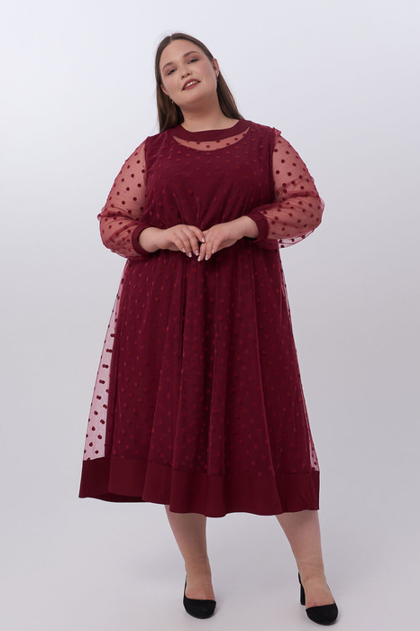 Оригинальное двойное платье А - образного силуэта. Верхний слой платья выполнен из мягкой сетки флок «горох». Круглый вырез горловины оформлен притачной обтачкой и дополнен по центру спинки застежкой на петлю и пуговицу. Рукава втачные длинные, по низу дополнены трикотажной манжетой. Широкая притачная вставка по низу и обтачка горловины в качестве отделки выполнены из ткани компаньона. Нижний слой платья выполнен из плательной ткани в тон верха. Горловина оформлена окантовкой. Слои скреплены между собой в области проймы.  Модель прекрасно подойдет обладательницам любых форм и поможет создать интересный вечерний образ.