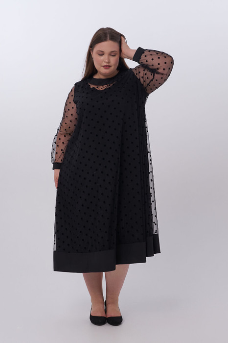 Оригинальное двойное платье А - образного силуэта. Верхний слой платья выполнен из мягкой сетки флок «горох». Круглый вырез горловины оформлен притачной обтачкой и дополнен по центру спинки застежкой на петлю и пуговицу. Рукава втачные длинные, по низу дополнены трикотажной манжетой. Широкая притачная вставка по низу и обтачка горловины в качестве отделки выполнены из ткани компаньона. Нижний слой платья выполнен из плательной ткани в тон верха. Горловина оформлена окантовкой. Слои скреплены между собой в области проймы. Модель прекрасно подойдет обладательницам любых форм и поможет создать интересный вечерний образ.