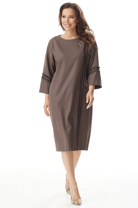 Элегантное и комфортное платье свободного силуэта со спущенным рукавом. Длина рукава 7/8. По спинке застежка на потайную молнию. По спинке внизу добавлен разрез. Особую изюминку платью добавляет декоративная отделочная тесьма и съемная брошь. Длина платья от плечевого шва 110см. Длина рукава 52см.