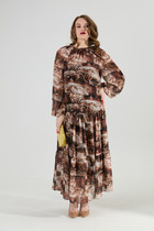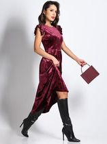 Нарядное платье полуприлегающего силуэта , без подкладки.   Вырез горловины округлой формы. Левый рукав втачной , правый выполнен как крылышко. Платье выполнено из плательной ткани, дополнено отлетной деталью из шифона в горох.  Платье приталено за счет съемного пояса золотого цвета. Пояс по правой стороне фиксируется под шифоновой деталью. (в комплекте)  По правому боковому шву в платье  разрез. Длина платья от плечевого шва 126см. Длина левого рукава  46см. Длина правого рукава (крылышка) 30 см.
