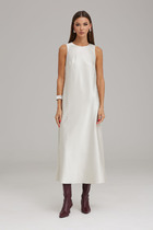 Элегантное платье А-силуэта с центральной застежкой на пришивные пуговицы. Платье выполнено из струящейся плательной ткани, дополнено по плечевому поясу и рукавам шифоном в тон основной ткани. Рукав слегка спущен, дополнен манжетой с застежкой на пуговицу. Платье приталено за счет съемного пояса с пряжкой, выполненного из основной ткани. Длина платья от плечевого шва 120 см. Длина рукава 59 см
