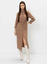 Стильное и утонченное платье прилегающего силуэта из красивой гладкой, слегка мерцающей ткани.  Рукав втачной, с разрезами. Горловина округлой формы. По талии платье отрезное. По спинке застежка на потайную молнию, по низу шлица. Платье дополнено по горловине и рукавам  декоративной тесьмой с жемчужной нитью. По талии дополнено красивым кожаным поясом с отделкой из жемчуга на пряжке.  Длина платья от плечевого шва 126см.  Длина рукава 47см.