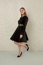 Летнее, женское платье свободного покроя, выполнено из летней ткани лен-вишер. Горловина платья округлой формы, на притачной обтачке из основной ткани, на полочки обработаны вытачки. Также на полочке выполнен декоративный элемент по линии груди, присборенный волан из основной и кружевной ткани, который перекрыт по одной стороне широкой патой, все это украшено бусинами на прокол. По нижней части полочки, с одной стороны выполнен разрез, который декорирован притачным воланом. Спинка платья из основной ткани, со средним швом и вытачками, рукав втачной, укороченный, с разрезами по низу. Эффектное, летнее платье для обладательниц роскошных форм добавит в ваш образ романтики!