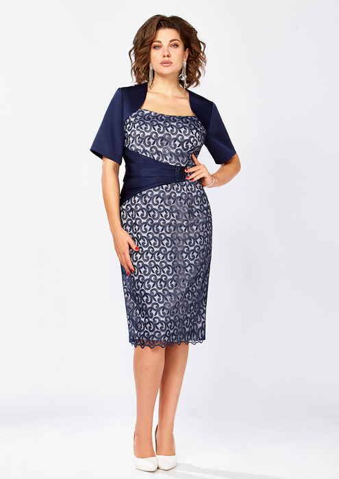 Элегантное женское платье полу-прилегающего силуэта, выполнено из атласа и кружева. На полочке из кружева, обработан втачной пояс из атласа, со складками и втачным элементом, декорированным стразами. Горловина округлой формы, на обтачке, на лифе обработаны кокетки из атласа. Юбка платья выполнена из кружева, заужена к низу. Спинка выполнена из атласа, со средним швом и полурельефами, рукав втачной, укороченный, также из атласа. Нарядное, женское платье с эффектным акцентом по линии талии, отличный выбор для торжественных мероприятий!