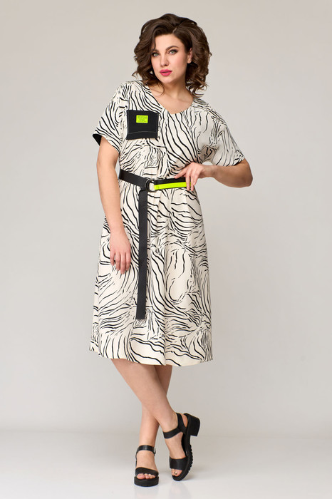Платье выполнено из вискозного полотна, максимально комфортного и легкого. По переду v-образный вырез горловины и накладной карман с декоративным нашивным элементом. Рукав одношовный, линия плеча слегка спущенная. Спинка разрезная по среднему шву, шов декорирован нашивным элементом. В комплект входит пояс. Длина платья 111 см. Длина рукава от горловины 34.