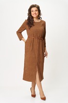 Элегантное платье Х-образного силуэта, отрезное по линии талии из струящейся ткани «санторини». Округлый вырез горловины, обработан обтачкой. Модель со спущенным цельнокроеным рукавом. Лиф выполнен из принта «зебра». По переду и по спинке заложены складки по линии талии. По переду и спинки в юбке застрочены таллиевые вытачки. Спинка со средним швом и застежкой на потайную тесьму-молнию. По бокам настрочены шлевки, имеется съемный пояс с декоративной пряжкой. Платье без подкладки.