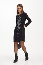 Платье полуприлегающего силуэта. Перед с нагрудными вытачками. Спинка со средним швом, заканчивающимся шлицей. Рукава втачные одношовные. Горловина обработана бейкой из основной ткани. Дополняет модель пояс.