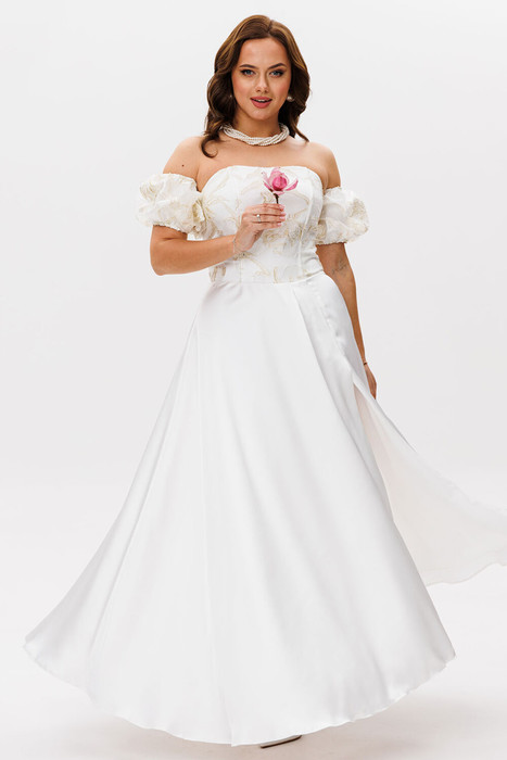 Платье женское приталенного силуэта, отрезное по линии талии. По лифу переда и спинки расположены рельефы. Юбка расклешенная с разрезом по переду. Застежка на потайную тесьму-молнию в среднем шве. Дополнительной застежкой служит шнуровка корсетного типа по спинке. Рукава съемные, держатся на резинке.