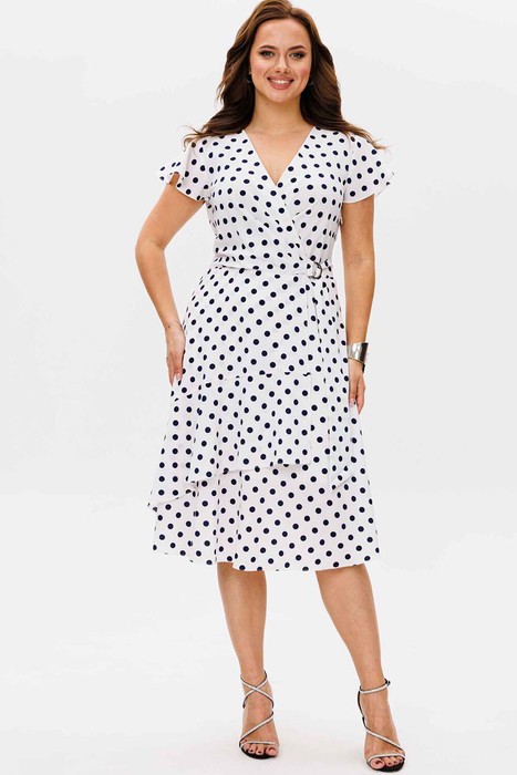 Платье женское, отрезное по линии талии; с запахом; с молнией в левом боковом шве; с поясом, продевающимся в два полукольца; с разрезом в правом боковом шве; выполнено из тонкой, плательной ткани в мелкий горошек. Перед: лиф с запахом, на юбке верхний слой-отлетной. Спинка со средним швом. Рукава короткие, расширенные к низу, типа «крылышки». Изделие на тонкой трикотажной подкладке