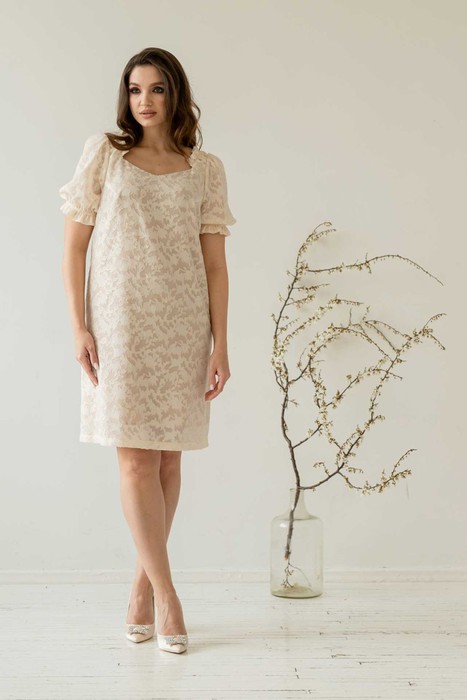 Платье женское А- силуэта выполнено из ткани шитьё ришелье на шифоне. Перёд с нагрудными вытачками. Кокетка переда и спинки присборена с рюшей. Горловина фигурная. Рукава одношовные втачныет «фонарики»  по низу кулиса. Ширина низа рукава регулируется. Платье на хлопковой тонкой подкладке.