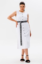 Платье женское полуприлегающего силуэта, отрезное по линии талии, на резинке, без рукавов, выполнено из тонкой плательной ткани. Юбка, слегка расклешённая к низу. По переду застёжка на воздушную петлю и пуговицу. Горловина круглая с небольших рюшей. Широкие воланы от плеча до талии. Платье дополняет пояс. Платье на тонкой трикотажной подкладке.