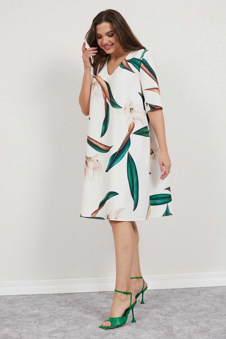 Платье женское А- силуэта выполнено из принтованной плательной ткани. Застёжка потайная тесьма молния в центральном шве спинки сверху. Горловина v-образная. Рукава двухшовные втачные. Платье без подкладки. Дополнением служит декоративный пояс.