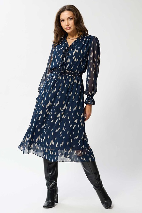 Платье женское свободного силуэта, отрезное по линии талии, расклешённое к низу, выполнено из ткани шифон. По линии талии сборка на резинку «венгерку». Горловина v-образная с небольших рюшей по переду до линии талии на завязках. Рукава одно шовные втачные, по низу сборка на резинку «венгерку». Платье на тонкой трикотажной подкладке.