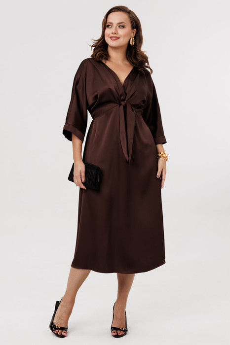 Нарядное женское платье, выполненное из струящегося шелка «Армани» (тянется), без подкладки. Платье отрезное выше линии талии. Верхняя часть покроя «Летучая мышь», нижняя часть – «полусолнце».  Лиф переда с фигурным подрезом и мягкой складкой от линии плеча, переходящей в линию пояса. Завязывающегося под грудью. Лиф спинки со средним швом, с застежкой на навесную петлю-пуговицу. По линии подреза спинка присборена резинкой. По низу рукавов – притачные манжеты. Платье без карманов.