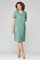 Эффектное двубортное платье длиной миди из облегчённого денима полуприлегающего силуэта. Линия плеча приспущена, рукав втачной три четверти с манжетой и патой. Горловина обработана обтачкой с  V-образным вырезом. Линия талии акцентирована притачным поясом. Имеются карманы в боковых швах. Изделие застёгивается на кнопки. Без подкладки.