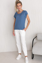 Эффектное двубортное платье длиной миди из денима полуприлегающего силуэта. Линия плеча приспущена, рукав втачной три четверти с манжетой и патой. Горловина обработана обтачкой с V-образным вырезом. Линия талии акцентирована притачным поясом. Имеются карманы в боковых швах. Изделие застёгивается на кнопки. Без подкладки.