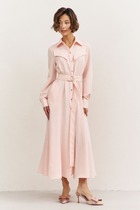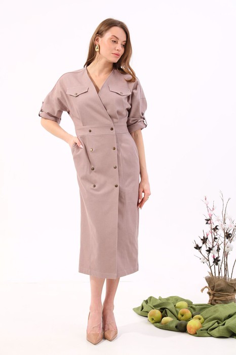 Эффектное двубортное платье длиной миди из денима полуприлегающего силуэта. Линия плеча приспущена, рукав втачной три четверти с манжетой и патой. Горловина обработана обтачкой с V-образным вырезом. Линия талии акцентирована притачным поясом. Имеются карманы в боковых швах. Изделие застёгивается на кнопки. Без подкладки.