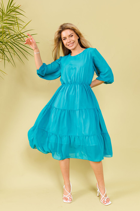 Воздушное платье А-образного силуэта, отрезное по линии талии, собрано на резинку. По спинке застёжка-капелька. Рукав втачной одношовный, слегка присборен на резинку по окату. Изделие на подкладке.