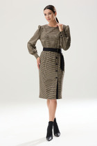 Изящное платье - рубашка прямого кроя из вискозного полотна с акцентным принтом. Горловина обработана рубашечным воротником с отрезной стойкой. Модель со слегка приспущенной линией плеча и длинным рукавом с манжетами. Длину рукава можно регулировать с помощью пат. Застёжка центральная на петли и пуговицы. По боковым швам расположены карманы. По низу изделия разрезы. В комплект входит пояс из основной ткани.