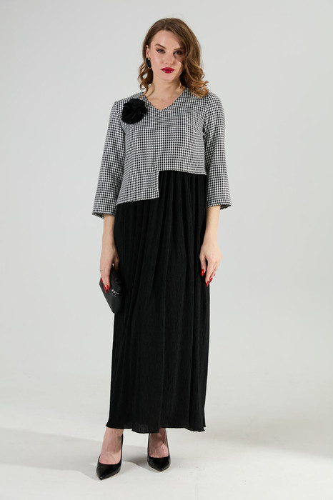 Платье свободного силуэта с фигурным лифом, на молнии по спинке, отрезное по линии талии. Горловина с V-образным вырезом. Рукава втачные три четверти. По переду подрезы по талии. Изделие на подкладке. В комплект к изделию идёт авторская съёмная брошь ручной работы.