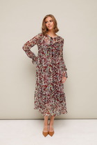 Эффектное двубортное платье длиной миди полуприлегающего силуэта. Линия плеча приспущена, рукав втачной три четверти. Горловина обработана обтачкой с  V-образным вырезом. Линия талии акцентирована притачным поясом. Имеются карманы в боковых швах. Изделие застёгивается на пуговицы. Без подкладки.