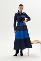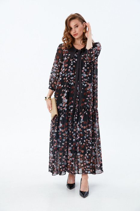 Платье состоит из двух платьев: нижнего и верхнего. Верхнее платье макси прямого свободного силуэта с воланом по низу изделия. Рукав втачной с притачным манжетом. Горловина обработана плосколежащим воротником из отделочной ткани фигурной формы. Центральная застёжка на петли и пуговицы. Нижнее платье комбинация на регулируемых бретелях.